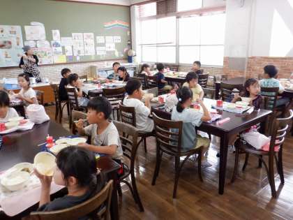 食の学習で、北山先生から、牛乳のパワーについて教えてもらいました。牛乳が、他の飲み物に比べると、カルシウムがた〜〜〜くさん含まれていることに驚いていました。その後、憧れのランチルームで給食を食べました。今日もおいしくいただきました!