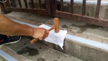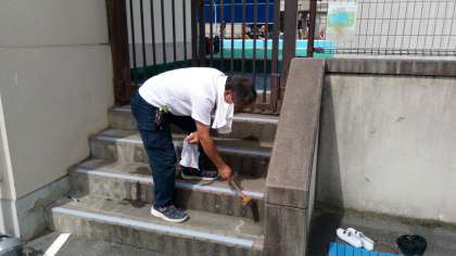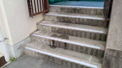 プール学習が終わった後に、階段ですべる場面が何度か見られたので、「気をつけましょう」の指導と併せて、すべり止めテープを貼りました!