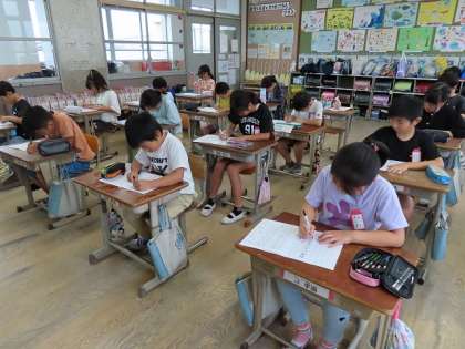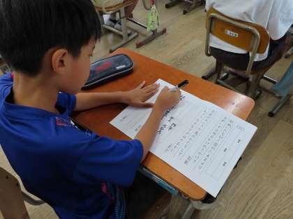 「書写・硬筆」サインペンで短歌を視写しています。消しゴムを使うことのできない緊張感の中、頑張って書いています。
