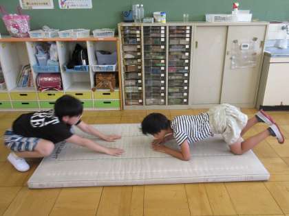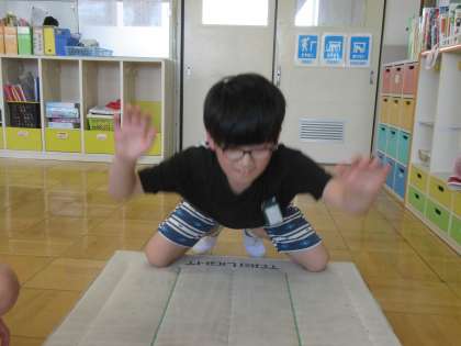 「腕で三角形を作るよ。」と担任が伝えると、すぐにコツを覚え、マットを強く叩いてパーンと鳴る音を楽しみながら何度も練習していました。