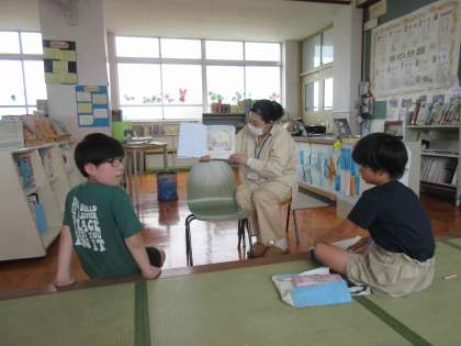 図書館へ行き、木曽先生に「アイスクリームおうこく」という絵本を読み聞かせしてもらいました。