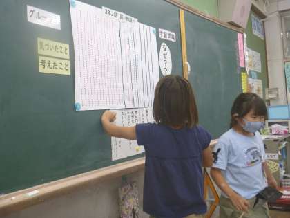 クラスで買い物調べをもとに・・・スーパーマーケットに多くのお客さんが集まるのは何か秘密があるはず!とたくさんの予想をもちました。「安い日があるのかな」「新鮮なものを売っているからかな」などと、たくさん考えていました!