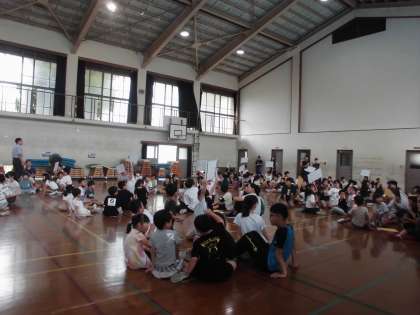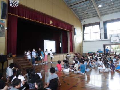 さて、放送委員からの問題です。「音楽室から図書館までのろうかの長さは何メートルでしょう。」なかよしグループごとに集まってみんなで考えました。答えは・・・・?