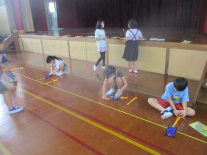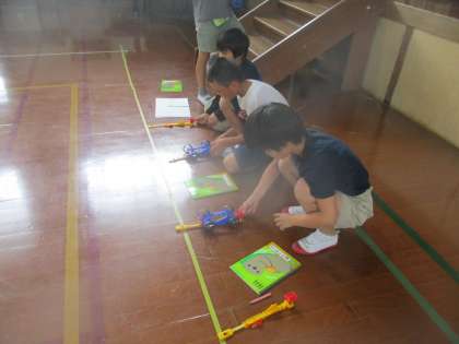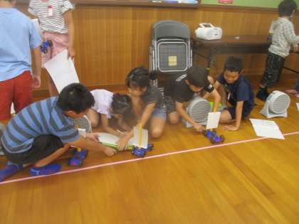 いよいよ実験のとき・・・子どもたちは楽しみにしていました!自分の作った車で実験を進めるうれしさがたくさん伝わってきました。