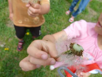 たんぽぽのわたげを飛ばす遊びをみつけたようです。