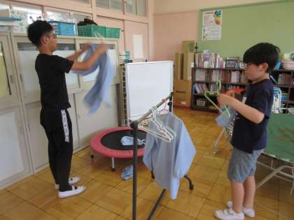 給食エプロンを使った後、家庭科室の洗濯機で洗濯し、プレイルームに干しました。夏休み中の学習会の時に、たたむ予定です。