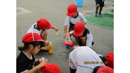 赤・青・黄・白・緑などの色水を、自分で考えた量で混ぜて、色水遊びを楽しみました。「先生、青と赤で紫ができた。」「〇〇君と同じ色を混ぜたけど、出来上がった色の濃さがちがう。」など、出来上がった色水から、色々な発見をして楽しんでいました。