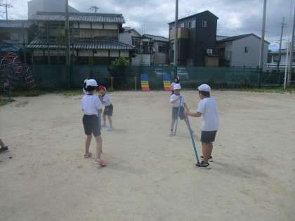 棒を使った体ほぐしの運動を行いました。ねらい2では、自分たちで遊び方を考えて取り組みました。