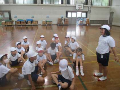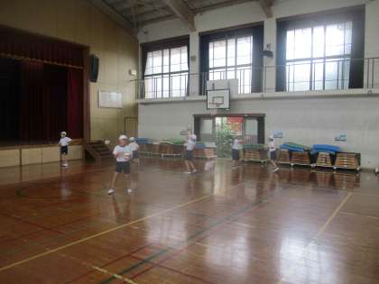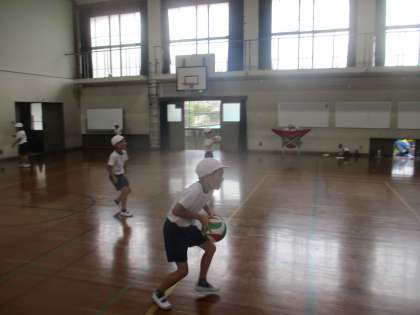 ようぐあそびの学習では、ボールを使った活動を行いました。片手や両手、チェストパスを工夫しながら試していました。