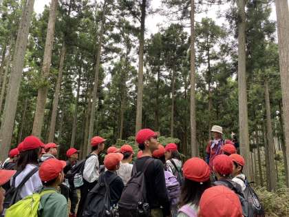 今日は川での活動があります。親水広場までのハイキングの様子です。自然のお話、木のお話を聞きながら、山道を歩いています。