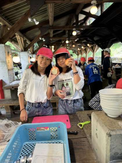 二度目の野外炊事ともなると手際がよい!玉ねぎに涙を流しながらも頑張ってます。