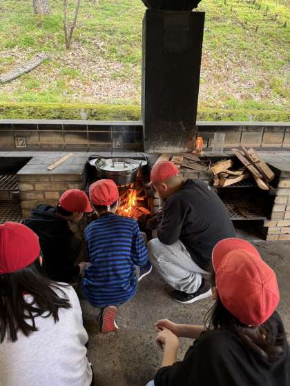 先ほど自分たちで起こした火を薪に移して、調理に使います。空気の通り道を考えて火を絶やさないように。