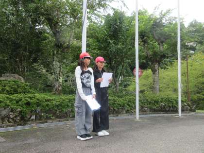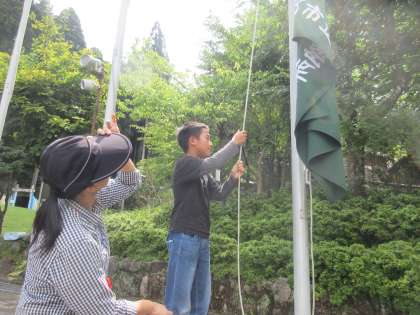 入所式の様子です。リーダーを中心にしっかりと進めることができました。校歌を歌う時には、学校の旗をあげました。