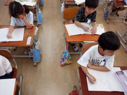 国語で「やくそく」というお話を読んでいます。役割を決めてあおむしたちがけんかをしている場面を読んだり、ノートにどんな場面なのかを書いたりしました。場面の様子や登場人物の行動を想像しながら、読んでいきます。