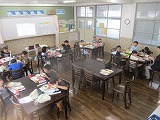 ランチルームで食べる日。とても楽しみにしていました!教室とはまた違い、みんなでテーブルを囲みながら食べています。