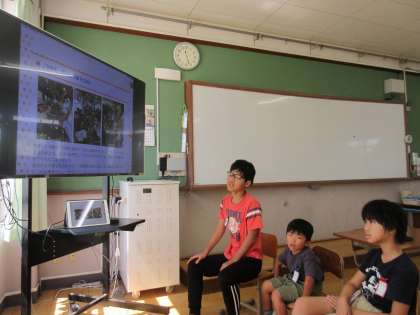 そして、学校のホームページをみんなで見ながら、花背山の家での出来事を、1年生や3年生に伝えました。