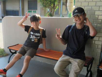 ベンチに座ってほっこりしている5年生の姿が微笑ましくて、担任がカメラを構えると、にっこりピース。花背山の家に行く前は、カメラを恥ずかしがっていた子どもたちですが、2泊3日の宿泊学習で、カメラにもすっかり慣れてくれました。
