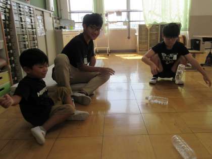 中間休みにペットボトルフリップをして遊んでいた子どもたち。