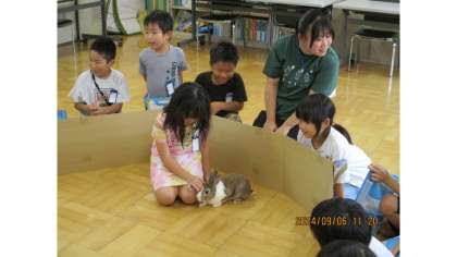 今日は、学校で買っているウサギの「ミルク」と触れ合いました。普段は、ウサギ小屋の外から見ているだけの「ミルク」を抱っこしたり、やさしく体をなでたりして触れ合いました。子ども達は、「思ったより重い」「ミルクの目がかわいい」などミルクとの触れ合いをとても楽しんでいました。