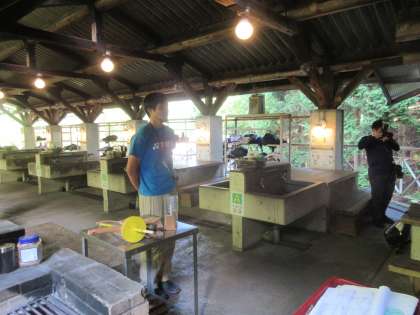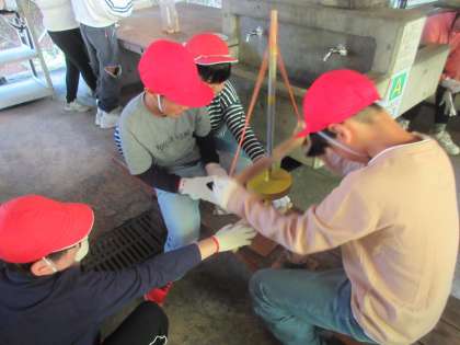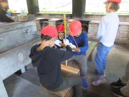 火おこし体験。みんなで協力しながら、一生懸命火をおこします。コツをつかむとどんどん火を起こせるようになりました。