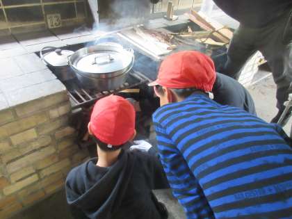 火おこし体験でできた火を、野外炊事で使いました。みんなで協力して起こした火は、きれいに輝いていました。