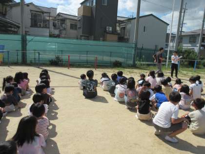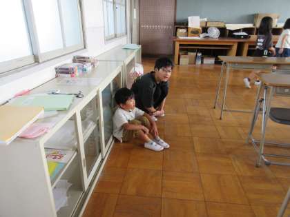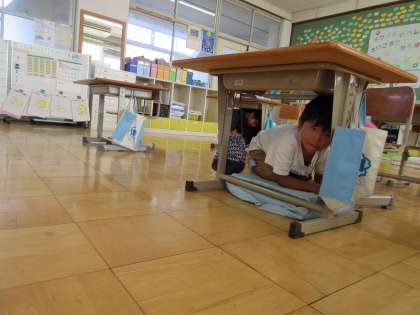 避難訓練がありました。机の下に入り、その後運動場へ避難しました。そして、桂川の堤防が一部決壊したという想定で、校舎の3階まで避難しました。