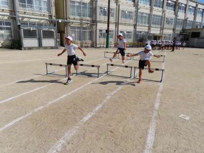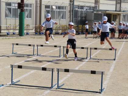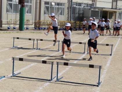 「ハードル走」今日は、自分に合ったインターバルを見つけるために、5メートル,5.5メートル、6メートルのコースを試してみました。スタートから一つ目のハードルまでをしっかりと走ることと、最後の直線に気を抜かないように意識して学習をしました。