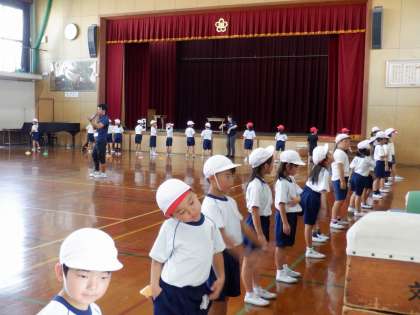 2年生と合同で、運動場ではどんなふうに移動して踊るのかを練習しました。しっかり話を聞いて、自分の動き方を覚えました。