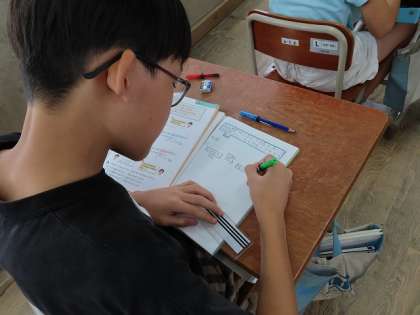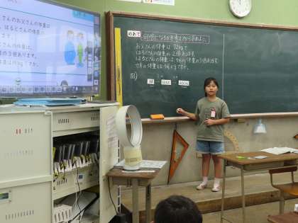 「割合」の学習をしています。複雑になってきた文章問題を関係図に書いて整理してから立式、解答につながるように考えています。自分の考えをしっかりと書ける子が増えてきました。