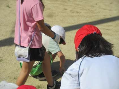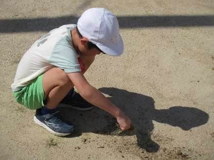 全校のみんなでなかよしグループに分かれて、草抜きや石拾いをやりました。細かいところまで草抜きをしている人がいました。暑い中がんばってくれました。
