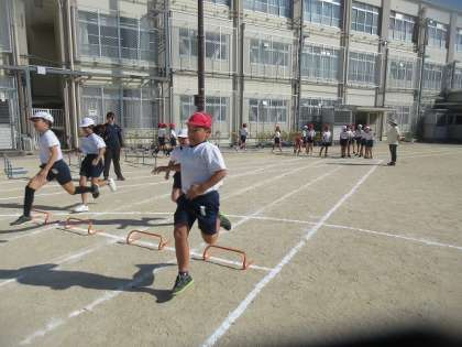 ハードル走をやりました。まずはミニハードルで歩幅を確かめながらリズムよくしっかり走っています。