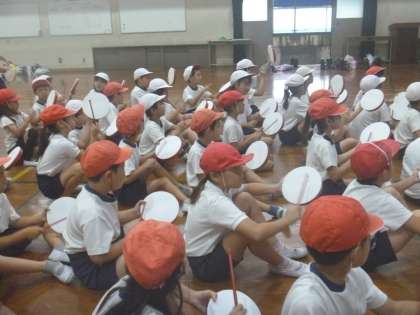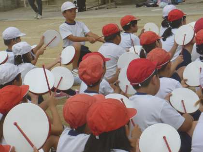 たいこを叩くタイミングや動きの確認をしました。動きを覚えた後は、みんなと動きをそろえながら踊ることやかっこよくダイナミックに表現することなどに力を入れています。