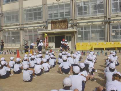 全校練習がありました。運動場に全校児童が集まりました。