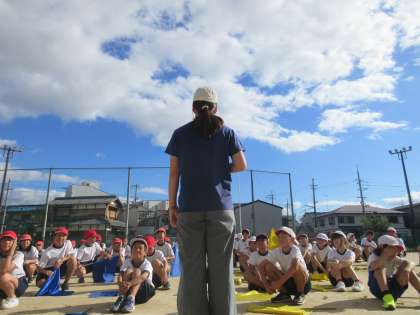 運動場でダンス・フラッグの練習をしました。本番まであと少し。最後に担任の先生が思いを伝えました。
