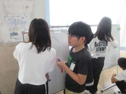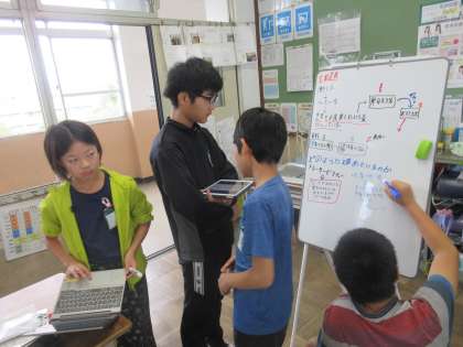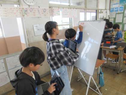 単元の学習問題について調べてきたことを、まとめています。それぞれの持っている情報を持ち出し、話し合いながら進めています。