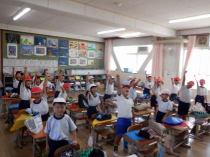 よいお天気の、運動会の朝です。教室で、「がんばるぞー!おー!」と気合を入れて、運動場へ!やる気満々です!