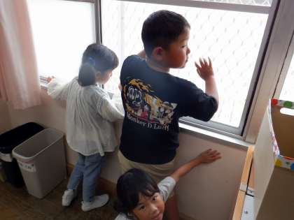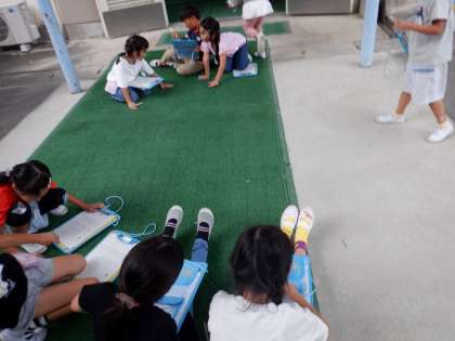 図画工作「さわりごこちはっけん」で、教室の中のいろいろなもの、職員玄関のあたりのものを触って、手触りを楽しみました。普段は触らないものをじっくり触り、とても楽しそうでした。押さえたときと撫でたときで手触りがちがうことにも気づいて、おもしろかったです。