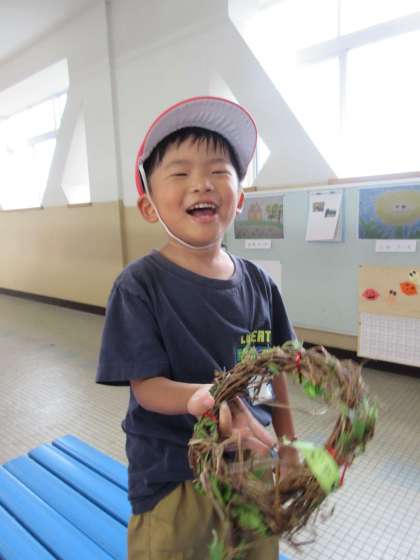 1年生が、生活の学習でアサガオのつるでリース作りをしました。飾りつけをするのが楽しみですね。