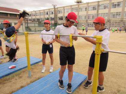 5年生は、体育で鉄棒となわとびをしました。補助具を使い、逆上がりに成功しました。