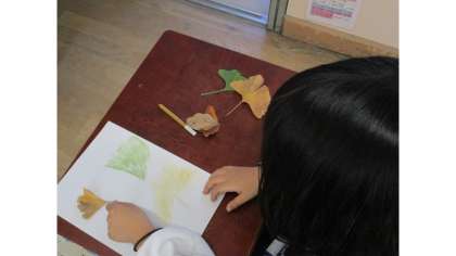 今日の生活科では、お気に入りの秋の葉っぱを見つけて、こすりだしをしました。葉っぱの模様が、きれいに出てくると「うわー すごーい」「きれい」などの声が、子どもたちからたくさん聞こえてきました。