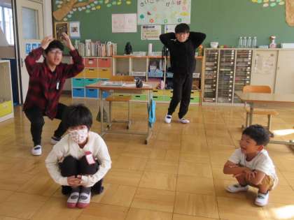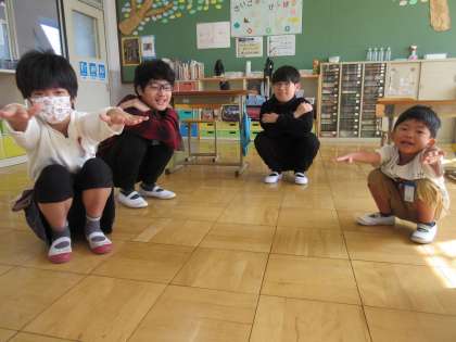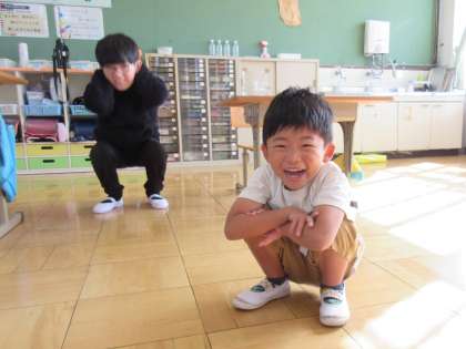 ただ「しゃがむ」だけでも4人で大盛り上がりしていた、3組の子どもたちでした。