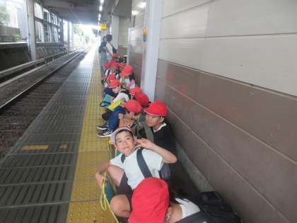 目の不自由な人のために点字ブロックをよけて電車を待っています。車内では、あまり大きな声を出さないでマナーを守って楽しんでいる様子がありました。