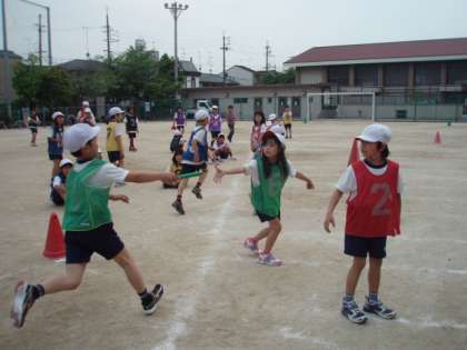 体育の学習でリレーをしました。バトンパスでは,パスされる少し前から走り出すことを意識して取り組みました。どのチームも力を合わせ,タイムを縮めることができました。