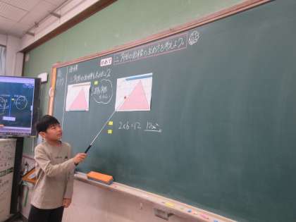 どうすれば三角形の面積を求められるのか考えました。みんなの前で発表をがんばりました。