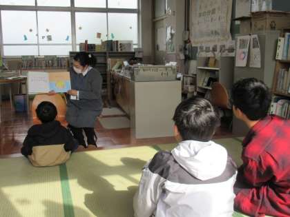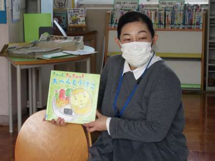 図書館司書の木曽先生に、「きゅっとぎゅぎゅっとおべんとうばこ」という絵本の読み聞かせをしてもらいました。