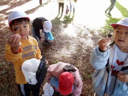 研究所の樹木園で、特大のまつぼっくりや、メタセコイヤなどを拾わせてもらいました。たくさん落ちているのを見て、「まつぼっくりの街みたい!」「まつぼっくりの国みたい!」と大興奮でした。