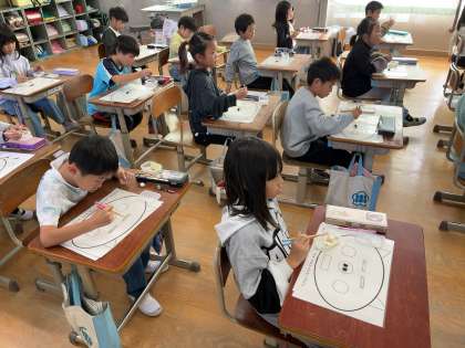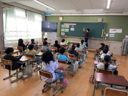 栄養教諭の北山先生に、正しい箸の持ち方を教えていただきました。子どもたちは苦戦しながらも、なんとか正しい箸の持ち方で持てるように練習していました。