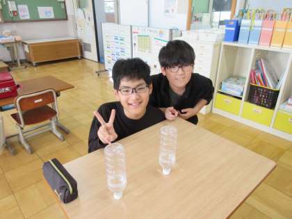 5年生がペットボトルフリップを楽しんでいたら、今日は何と、ふたりともキャップ側で立てることができて、大盛り上がりでしたよ。