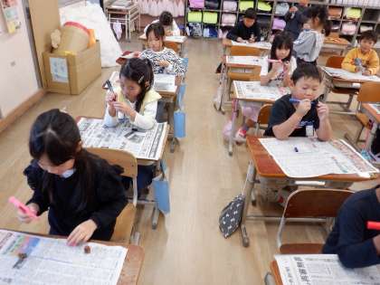 生活科「あきとともだち」で、森林総合研究所で拾ったどんぐりにペンで色を塗ったり顔を描いたりしてみました。「ペンで描けるのかな?」「つるつるだから、描けた!」「このペンでは、黄色はインクの色が見えない。」「黒っぽくなる。」といろいろな発見がありました。次は別のペンでもためしてみましょう。