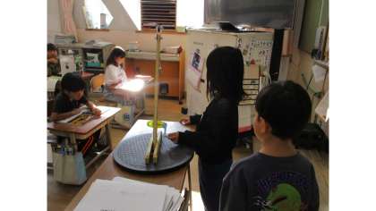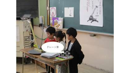 今、国語科では、「じどう車くらべ」の学習をしています。じょうよう車・バス・トラックの「しごと」と「つくり」を学習した後、クレーン車の「しごと」と「つくり」を学習しました。クレーン車のしごとの、重いものをつり上げるイメージが持てない子どももいたので、模型を操作して、イメージを広げました。
